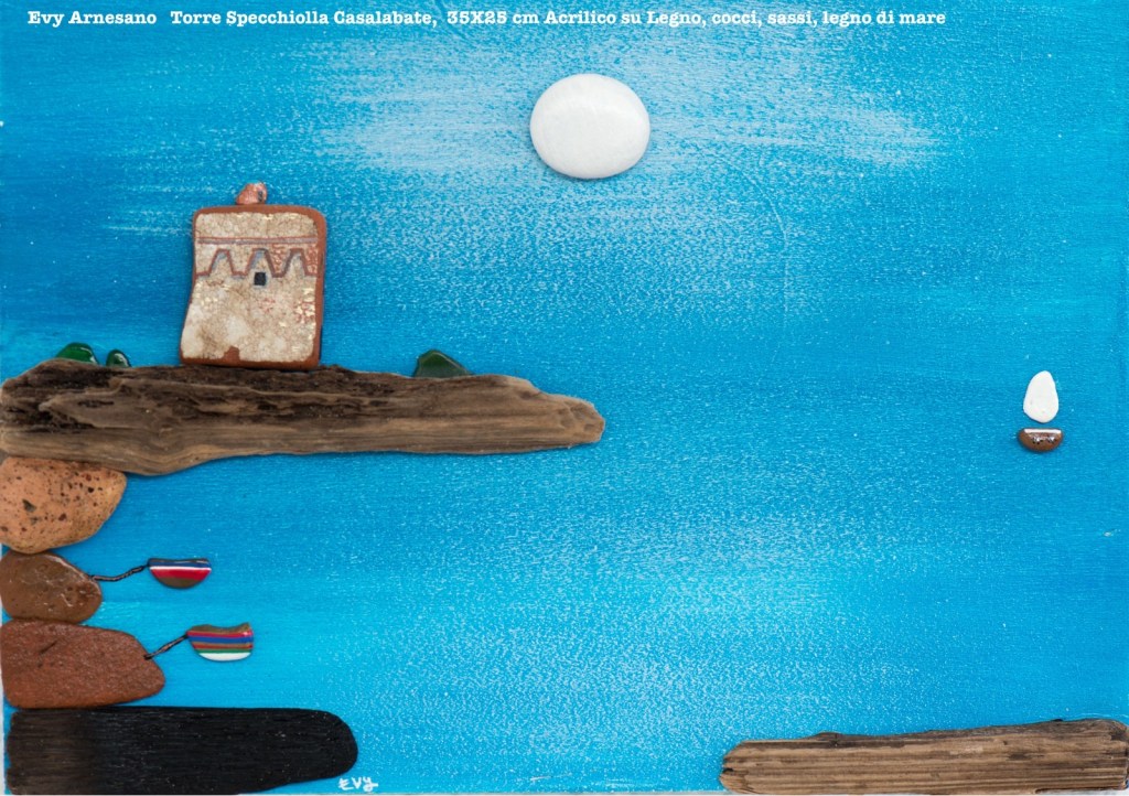 La vita segreta dei sassi, risvegliata dai colori del Mediterraneo e dalla melodia del Salento – dove nasce Evy Arnesano, musicista e cantautrice con importanti collaborazioni alle spalle, poi dedicata alla pittura – si esprime nella materia modellata dall’energia creativa dell’artista, nelle sfumature di mare e cielo, nel suono cromatico delle case baciate dal sole.